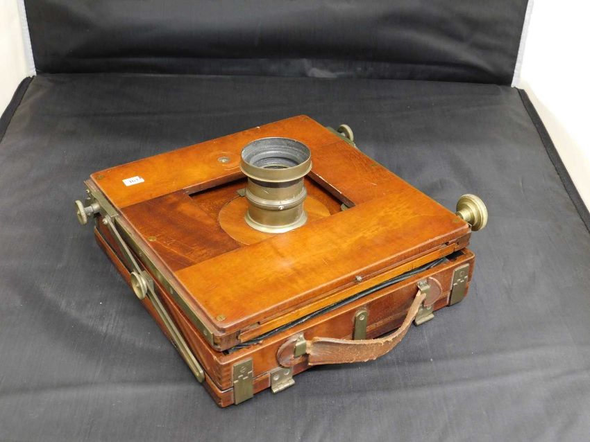 A J Lizar's 'Challenge' camera, mahogany cased with unmarked brass f/8 lens