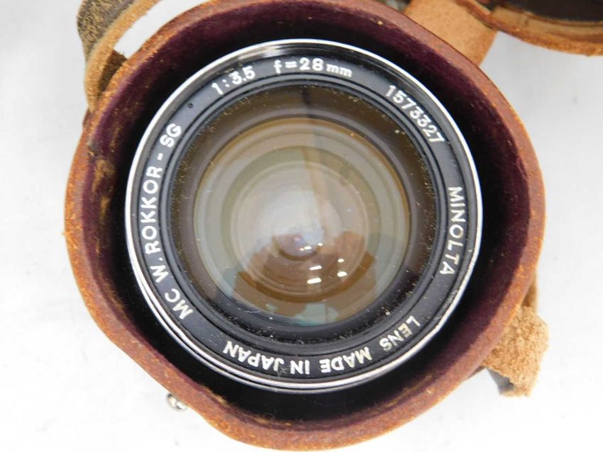 Minolta: a quantity of Minolta lenses and accessories to include a Minolta MC Tele Rokkor-PE f-200, no.1113340; a Minolta MC Macro f-50; a MinoltaMC W.Rokkor-SG f-28 no. 1573327; a MinoltaAuto tele Rokkor-PG f-135 no. 1300311; a Minolta Rokkor-TC f-100 no. 1117374; a Minolta extension tube boxed; another Minolta extension tube; a Minolta-SR Adapter for Leica Lenses, boxed; a Minolta macro bellows and assorted lens hoods