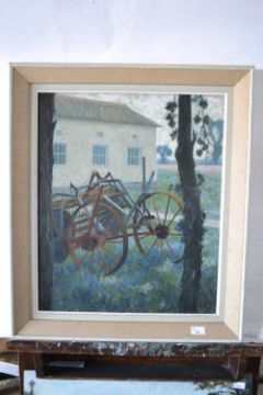Pauline Plummer, A rural setting with foreground plough, oil on board, indistinctly signed lower right, 60" x 50", framed