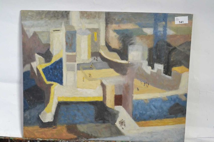 Attributed to Pauline Plummer, an abstract study of buildings and figures, unsigned, 51 x 41cm, unframed