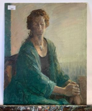 Pauline Plummer "Zoe in Green", oil on canvas board, signed and dated 1994, unframed, 81 x 40cm