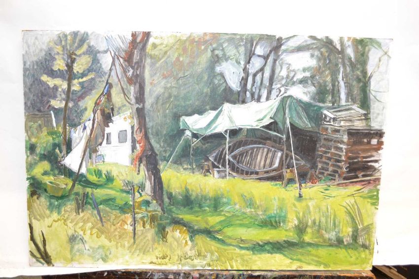 “My style is traditional. I enjoy the challenge of constructing a balanced composition from figures, still life or landscape. However it is landscape, which is my principal theme, usually including some structural feature such as a grand building like a church or mansion, or just a disintegrating hut, a bridge, a beached boat, or a wavering line of fence. I am fascinated by the changing colours and patterns of the agricultural scene, the brilliance of oilseed rape, or the dark shadows of potato furrows. There are also on a small scale, even in Norfolk, all those areas, which have been so carefully controlled, where the weeds grow high, and one can imagine oneself lost among them.