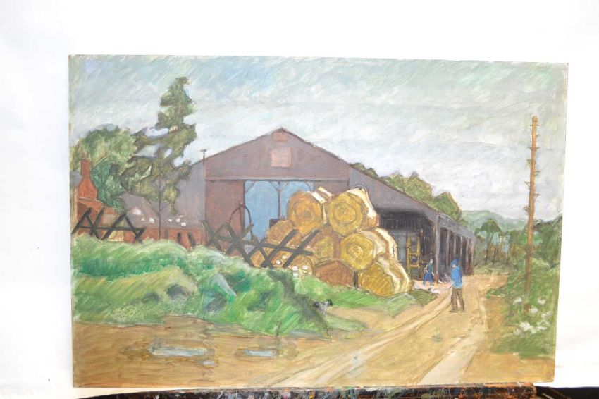 A set of four works on board, oil and acrylics including a farm at Reigate with hills ahead plus a lime kiln in Northumberland, 76 x 61cm approx