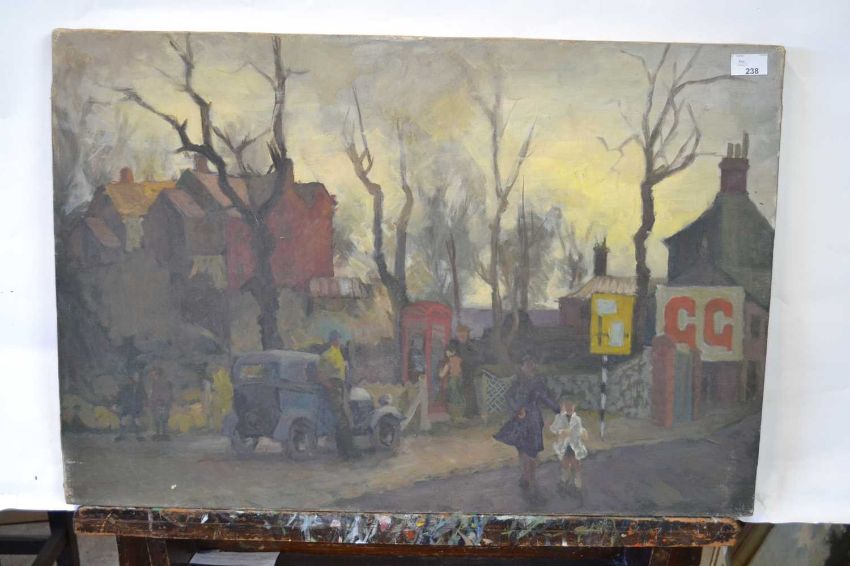 Attributed to Pauline Plummer, a street scene depicting figures and buildings in an autumnal or winter season, oil on canvas, unsigned, 76 x 51cm, unframed
