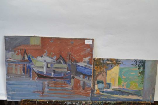 Attributed to Pauline Plummer, a group of ten works on board including "Commercial Harbour Palma Majorca", "Farmland Buildings, France" (unfinished), unframed, varying sizes, 26 x21cm smallest, 51 x 38cm largest