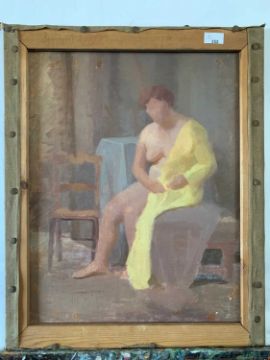Attributed to Pauline Plummer, life study of a female nude in an interior setting with an additional landscape, oil on canvas verso, 63 x 51cm, unframed