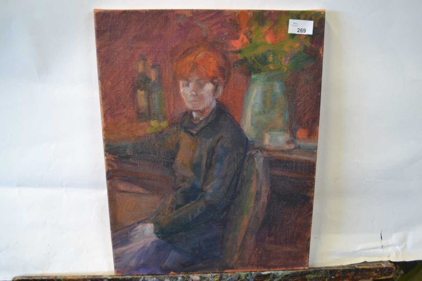 Pauline Plummer, an interior scene depicting a red headed lady sat before a vase of flowers, oil on canvas, inscribed P Plummer on frame verso, 46 x 36cm, unframed
