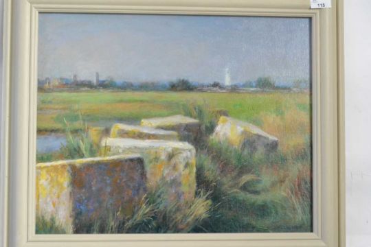 “My style is traditional. I enjoy the challenge of constructing a balanced composition from figures, still life or landscape. However it is landscape, which is my principal theme, usually including some structural feature such as a grand building like a church or mansion, or just a disintegrating hut, a bridge, a beached boat, or a wavering line of fence. I am fascinated by the changing colours and patterns of the agricultural scene, the brilliance of oilseed rape, or the dark shadows of potato furrows. There are also on a small scale, even in Norfolk, all those areas, which have been so carefully controlled, where the weeds grow high, and one can imagine oneself lost among them.