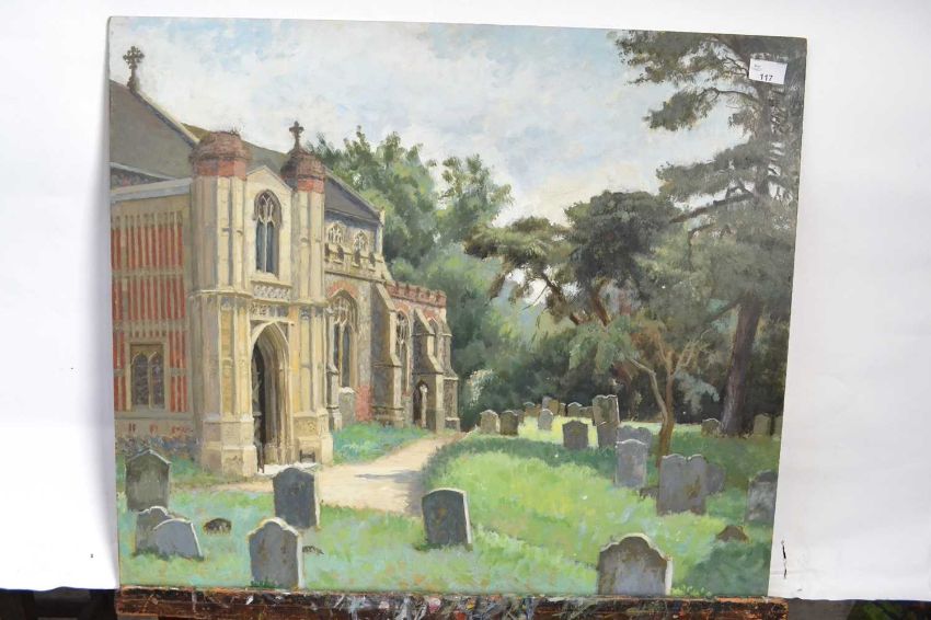Attributed to Pauline Plummer, a study across a church and graveyard, oil on board, unsigned, 71 x 61cm, unframed