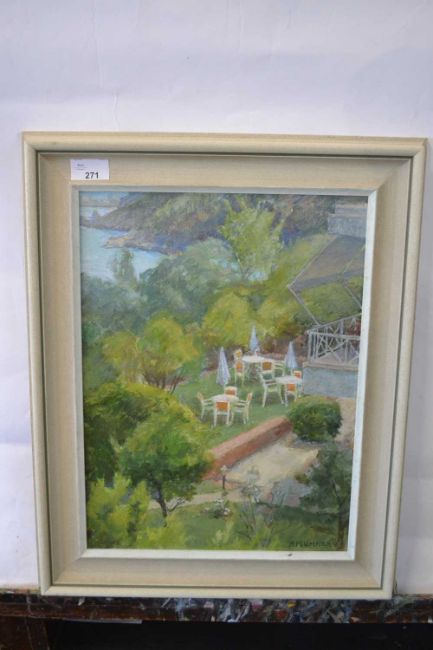 Pauline Plummer, a birdseye view over a coastal garden, signed and dated 1998, oil on board, 29 x 39cm, framed