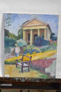 Attributed to Pauline Plummer, a botanical garden scene with a loan figure, watercolour on canvas, unsigned, 56 x 45cm, unframed