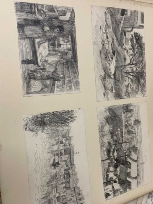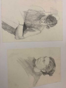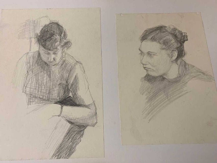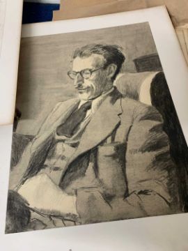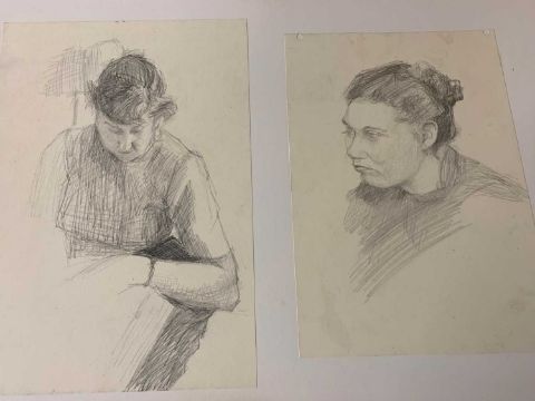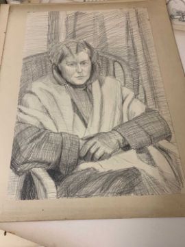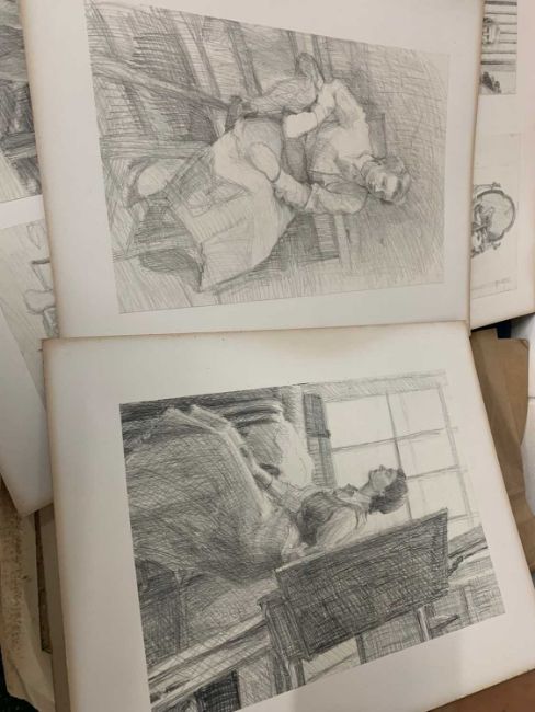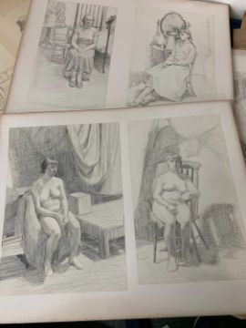 A substantial folder of assorted works including some oils on card and graphite life studies and interior settings