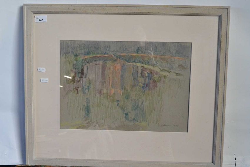Pauline Plummer "Anglezark Quarry", pastel, pencil on paper laid on board, signed and dated 1995, The Mall Galleries Pastel Society Exhibition 1996 label on back board, 40 x 29cm