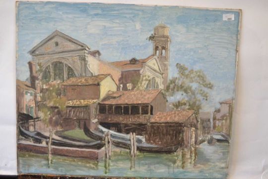 Attributed to Pauline Plummer, "Gondola Yard, Venice", acrylic on board, 76 x 51cm
