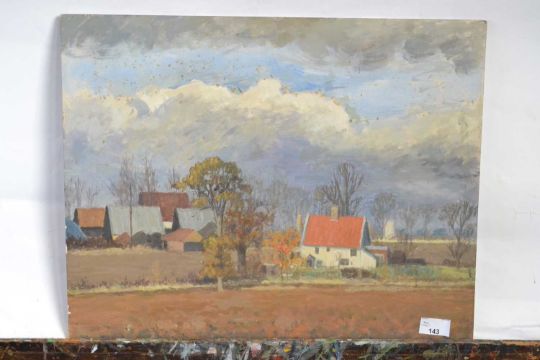 Attributed to Pauline Plummer, a countryside view across fields and buildings, oil on board, unsigned, 51 x 41cm, unframed
